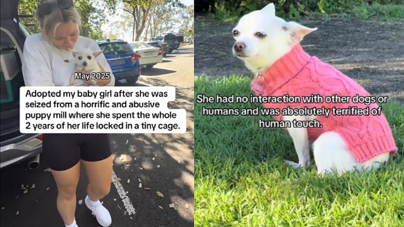 This sweet Chihuahua had spent her whole life confined to a tiny, filthy cage in a puppy mill. Watch her socialize with humans and other dogs for the first time.