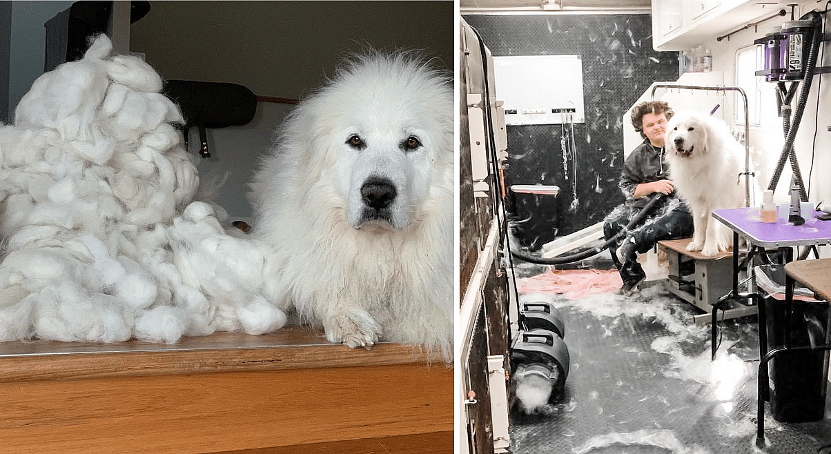 If you’ve ever been to a dog groomer while they’re working on a Great Pyrenees, you might have thought it was snowing inside! Great Pyrenees drop so much fur during heavy shedding seasons that it can take hours to brush or blow it all out.