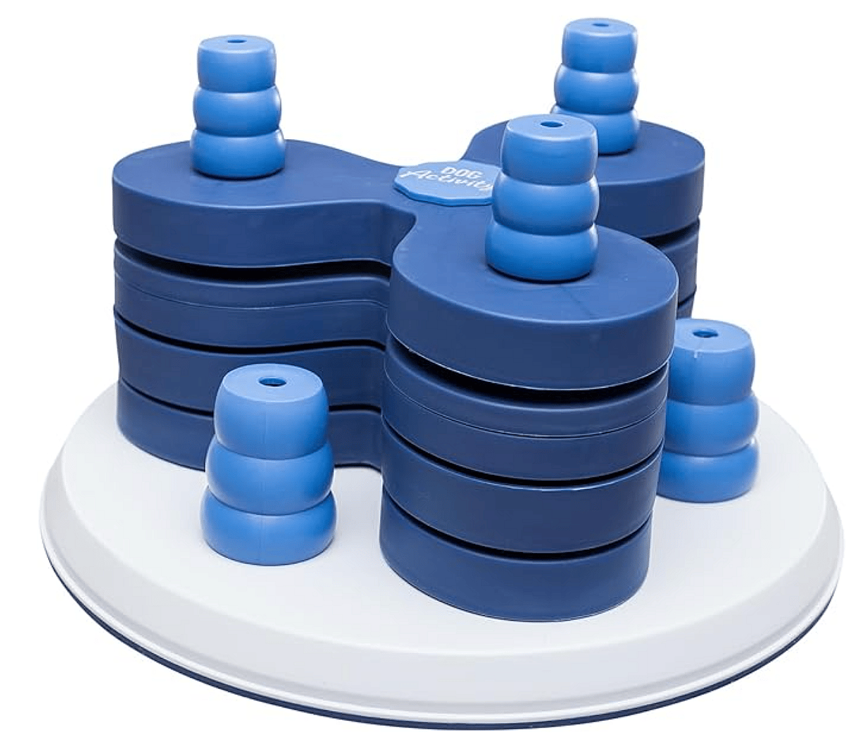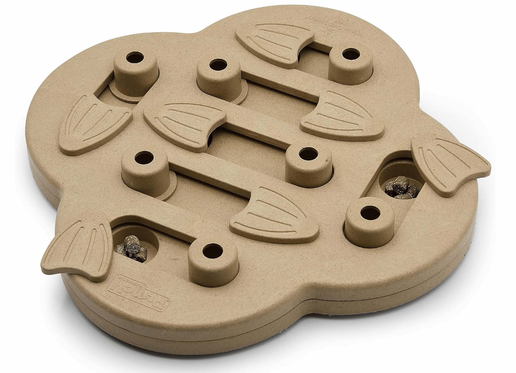The toy has tiles with holes at the top where you can hide treats, and the pooch has to sniff and figure out a way to retrieve the treats. It comes in various sizes and is a fun challenge for dogs already experienced with puzzle toys.