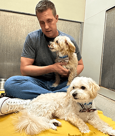 Buddy is little braver, willing to come up to the front of the kennel, but Bucky is a bit more reserved. However, after some good old fashioned TLC from Rocky, Buddy and Buddy both warm up to him and are happy for the attention. The best news of all? Both Bucky and Buddy have been adopted to new homes!