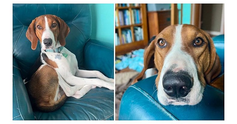 He has not been around children but is likely to become a beloved pet. He might not be ideal for a home with very young children because he occasionally startles with sudden loud noises. He has not been around cats but his even temperament seems conducive to co-existing. Walker treeing coonhounds are noted for their voices. He has one, but usually doesn’t use it. His goofy voice comes out full force when he welcomes his foster home, and in the mornings if he has been locked out of the bedroom. He is neutered, chipped, up-to-date with his shots (including canine influenza), has tested heartworm negative, and is on monthly heartworm preventative.