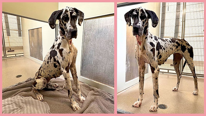 This Harlequin coated Great Dane female was brought into the shelter’s night drop nearly a week before Rocky comes across her. This girl unfortunately came in not only emaciated, but infested with ticks. The person who brought her into the night drop also brought in two other dogs, however those other two dogs have thankfully been adopted. She’s the only one left at the shelter back in isolation because she hasn’t been able to get a health check yet due to her growling and nervous behavior. When the person brought the dogs in, they apparently stated the 3 were running together near a school, but it seemed suspicious because it was an odd trio – a Great Dane, Basset Hound and Bulldog. The person took the time to put them in separate kennels, and the situation generally seemed odd to where it’s possible that this person was the owner.