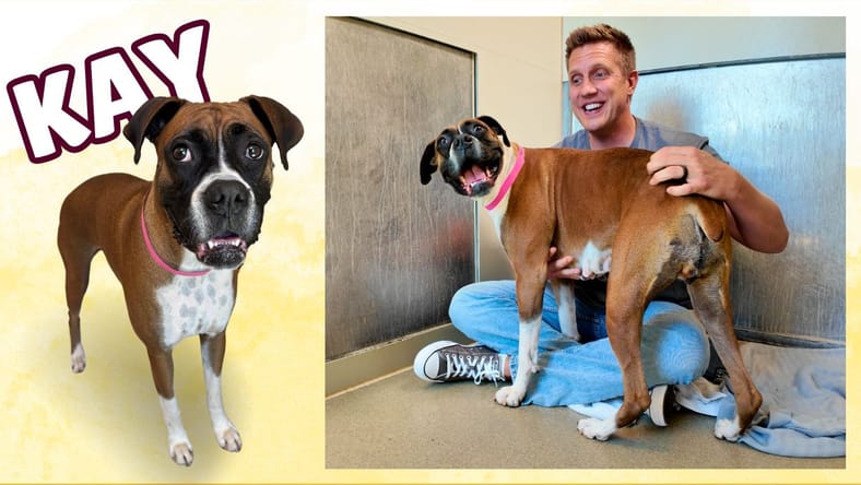 Kay is a 4 year old female Boxer that is new to the shelter, and was only on her 2nd day in at Animal Friends of the Valleys when Rocky discovers her with an XOXO on her kennel card. At this shelter, ‘XOXO’ usually meaning to proceed with caution and go slow. Unfortunately for Kay, she was an owner turn in, and actually came in with three other dogs – all Boxers. The reason for surrender was because the owner said one of the dogs went after the puppy in the home and bit the dog, but the owner isn’t sure which one of the dogs was actually responsible. Although the dogs are usually fine themselves, the owner has a small child at home, and they are afraid the child will be in the wrong place at the wrong time. All four dogs, including this girl, are not fixed and according to the previous home, the owner had litters of puppies they were having trouble getting them rehomed – this could imply Kay has had puppies before. We can also infer based on the owner’s turn in questionnaire that this girl and the other dogs were backyard dogs and kept as such, and even her canines were worn and broken far beyond what a normal 4 year old dog should have.