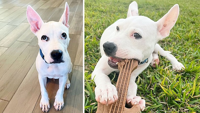 Flik is small – right around 20 pounds – and has ears that could function as antennas if needed. He has a blocky head but he’s lanky. He’s all white with a blonde bottom and tail. He has soulful eyes complete with dramatic black eyeliner. He is absolutely stunning!