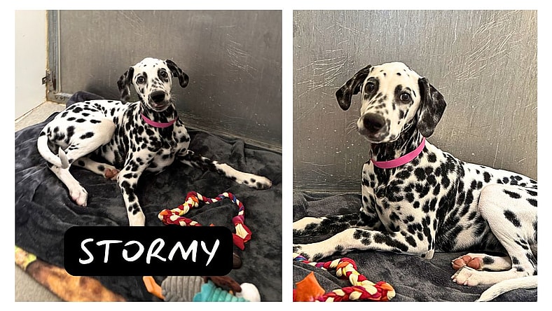 Stormy is a less than a year old Dalmatian female that was found roaming around a local stadium with her harness and leash attached. However, without an ID tag or a microchip, there is no way to contact a potential owner out there looking for her. She was turned into the shelter as a stray by a samaritan, and can only wait at the shelter to see if her family appears to bring her home. She is nervous and shy at the shelter understandably so, however warms up to Rocky soon after he enters her kennel. She was nicknamed after the stadium she was found near, Storm Stadium.