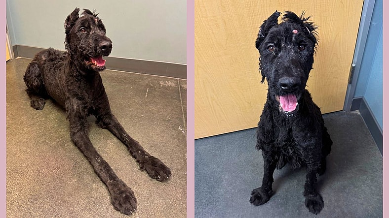 Valentina is a 2 year old old Giant Schnauzer that was found by Animal Control in the yard of a vacant home alone with severe injuries. She appears to have either serious road rash from being hit by a car, or she was burned by heat/fire. Immediately, Animal Control seized the girl to take her to the shelter to get her on pain medication from the shelter health check, and when a microchip was scanned, the shelter immediately went to contact the owner.