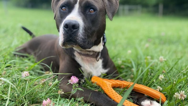 Vinny loves toys and splashing around in the water, especially on hot summer days. He likes exploring new places, going for scenic walks and playing with other dogs. He likes to play wrestle and tumble so having a doggie playmate with a similar play style is important. When he hangs out with a TVR team member in the office or break room he is very relaxed and enjoys a calmer environment in comparison to the kennels which can be loud at times. He enjoys car rides, naps on the break room couch, and getting tons of attention. He just melts onto the floor when you start petting him!