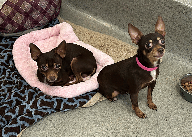Nicknamed by Rocky and Kelly with the help of their live audience, Wall-E and Eva are two 4 and a half year old Chihuahuas that made their way into Animal Friends of the Valleys thanks to a good samaritan finding them running along a main street in downtown near the area. It was clear right away that the two were a bonded pair, and so the shelter requires that they go together to a new home and cannot be separated. Wall-E is a male, and Eva is a female.