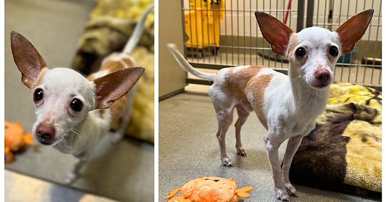 This small male Chihuahua is nicknamed “Wiggles” because of a Love Letter with Dogs from last episode to honor a dog that was important to a fan. Wiggles was found roaming the streets in a nearby city by Animal Control and brought into the shelter just the day before Rocky spots him. Without any collar, and later learning there is no microchip, no information about Wiggles’ past is known. All we know is that he is frightened and needs some love and gentleness.