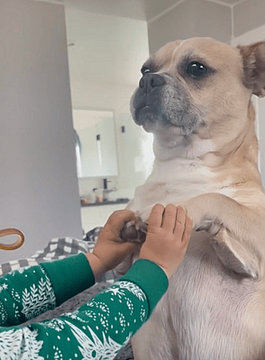 “Fast learner!” The California mom wrote over a video of Bentley and the baby captioned, “My one and half year old teaching the dog to sign ‘more’ to ask for more pets.’ In the action the young toddler signs “more”, where you flatten out your hands then bring your thumbs and fingers together and pull them apart repeatedly, to Bentley who seems to try his doggie hardest to copy. Although the little half French Bulldog and half Chihuahua (or Bullhuahua) found touching his paws together a bit of a challenge.