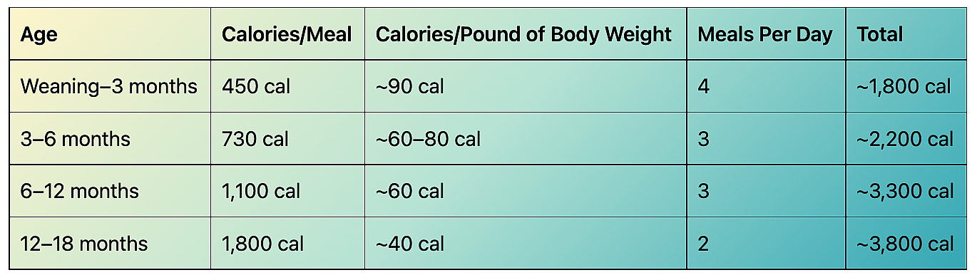 | Feeding Instructions | Puppies up to 3 months should be fed as much as they will eat. Puppies 3 months and up should get ⅔ of a can per day for every 5 lbs of body weight. So, a 50 lb 6-month-old puppy should eat 6 ½ cans per day or 3 ¼ cans per meal. |