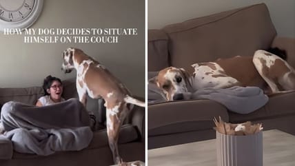 A viral TikTok video shows a large dog, a Great Dane, cuddling up with his parents while they are trying…