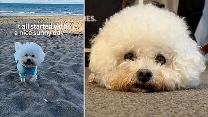 A beach day turned painful for a Bichon Frise who tore his cruciate ligament. After TPLO surgery, he's healing well…