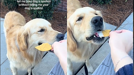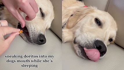 A TikTok video shows a Golden Retriever peacefully napping while her owners sneak Doritos into her mouth. She wakes up…