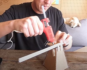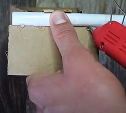 13. Then glue a 4×4 inch rectangle piece of cardboard on the opposite end of the paper roll, this will be where the paw pushes down on the lever.