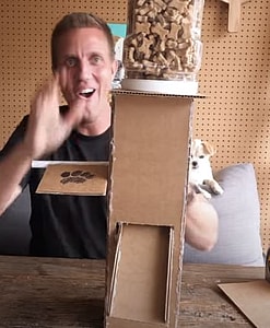 12. Cut a hole in the center of the lid of the jar wide enough for your treats to go through, then cut same size hole in the 5×5 inch cardboard top piece. Line the holes up and glue together. Fill the jar with treats, screw on the lid. Glue cardboard with the lid and treat jar on top of the funnel centered on the top of the treat dispenser so that the treats can freely go down the funnel.