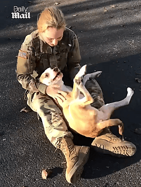 The heartwarming video, posted by @dailymail, shows Janna reuniting with Murphy after returning home from military service.