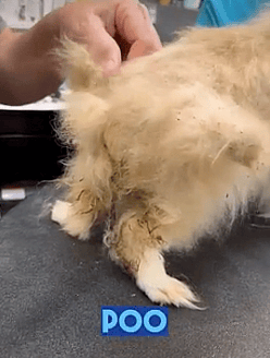 As the grooming progressed, the extent of the neglect became more apparent. The Pomeranian’s skin was in terrible condition, covered in dead, dry skin. The most distressing part was the discovery of poo around her bottom, which had caused significant irritation.