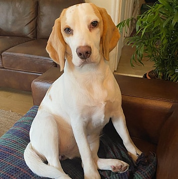 This pup’s cute face hides his devious nature. Bowie (full name: Boethia) loves to play and romp! He loves living in New York state, and his gorgeous coat coloris the perfect example of how lemon beagles tend to darken with time.