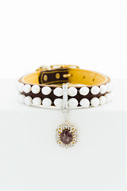 Our first designer collar comes from the in-house designers at A’maree’s, a high-end boutique in Newport Beach. Made from warm brown leather, this collar is adorned with natural pearls and a gorgeous sapphire and corundum pendant that transforms this collar from an everyday luxury to a fashion dog collar.