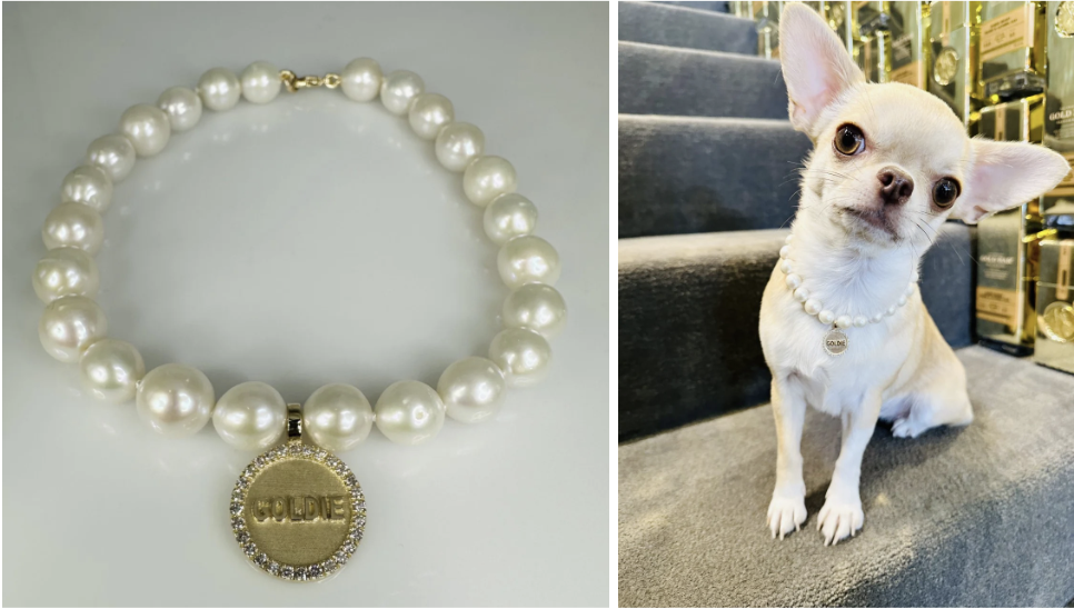 Celebrity designer Kyle Chan’s upscale dog collars are made from freshwater pearls, and feature a 14-carat gold name tag encircled in 0.15 carats of real diamonds. When you order trendy dog collars from Kyle Chan, your dog’s name is carefully engraved in gold, and made into a custom tag.