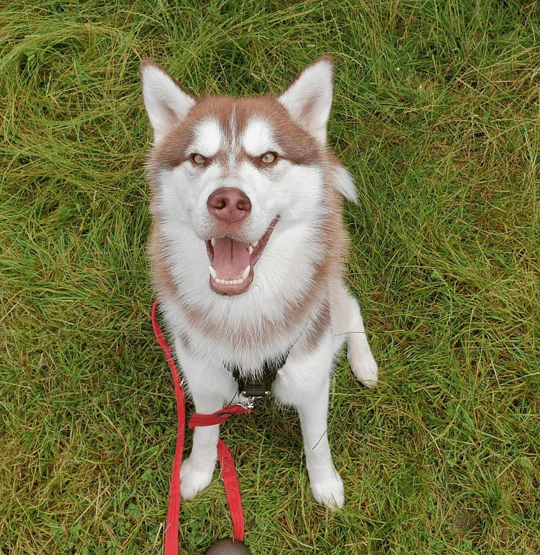Huskies are most likely to have mossy green or hazel eyes, rather than light or bright green. Some people might describe this type of green eye as “amber” and it’s most common in white or red and white Huskies.