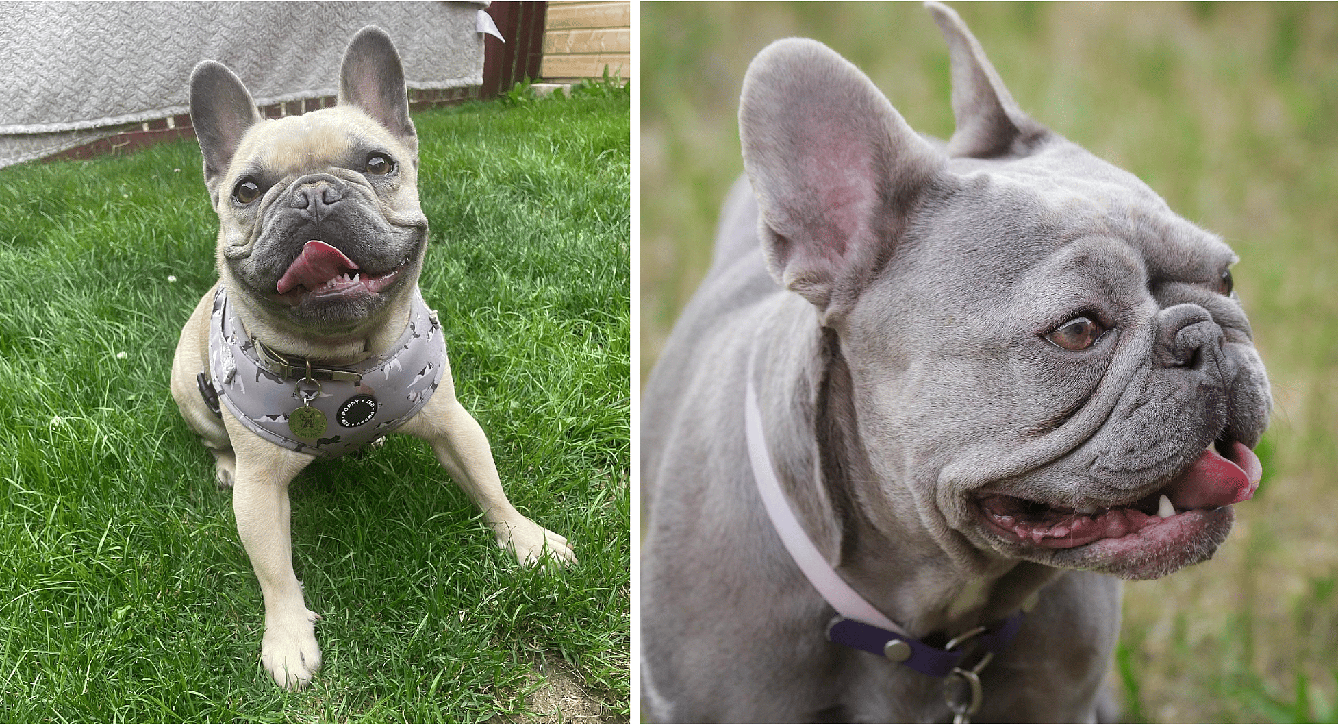 Blue fawn French Bulldogs are a derivative of fawn with additional dilution genes that give them a silvery hue and blue features. Lilac French Bulldogs, on the other hand, are a diluted version of standard blue French Bulldogs. Let’s take a look at a side-by-side comparison of a blue fawn (left) and a lilac (right) French Bulldog.