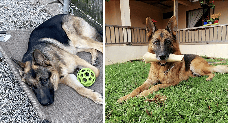 Black and tan is the most common German Shepherd coat color. Here’s a side-by-side comparison of a black and tan GSD (left) and a black and red GSD (right).