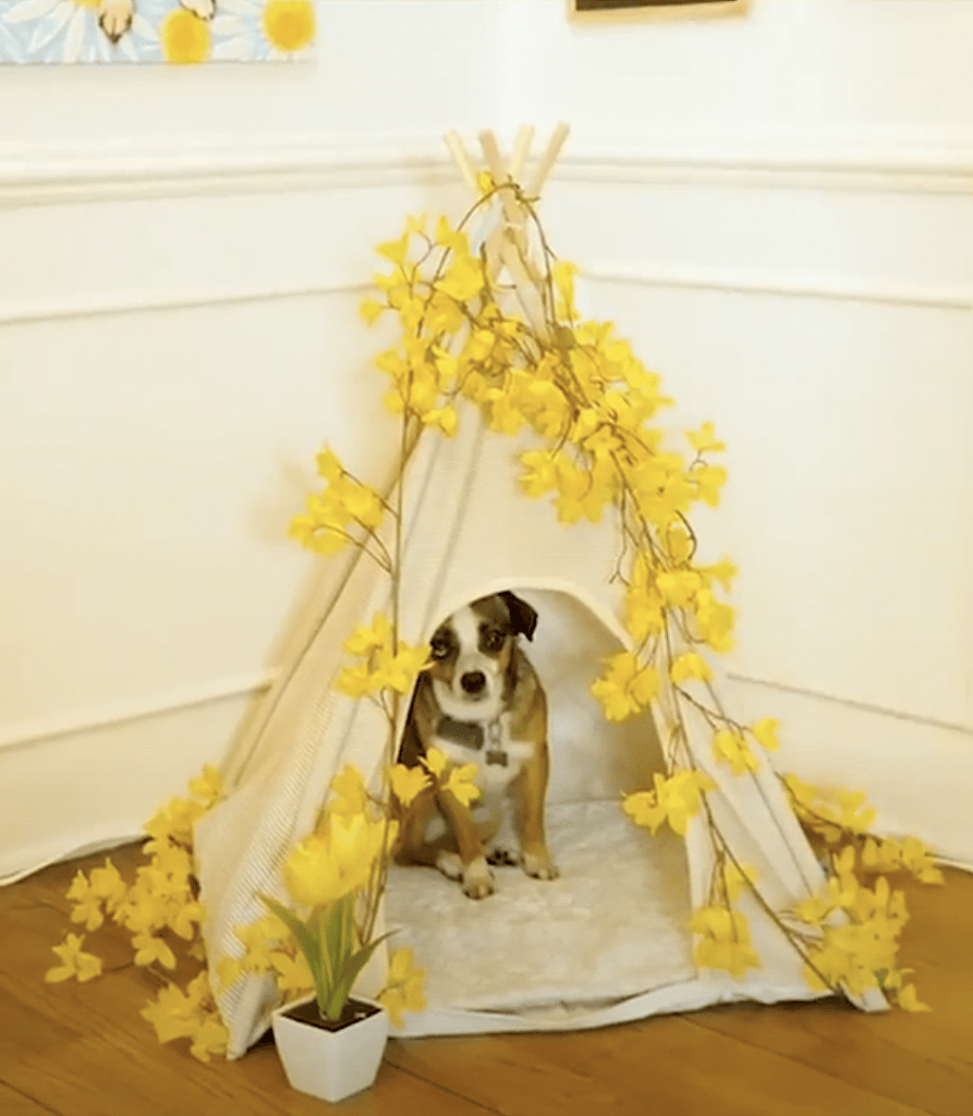We moved the dining room table. Who needs a dining room table anyway?! we put up a little doggy tee-pee, We put some soft blankets in there, and then we wanted the space to be reflective of who she was. So we put some flowers up. We even had a painting made of her one that was a really happy moment where she was having a good time and we hung that up so that this was a really positive, safe, comfortable space.