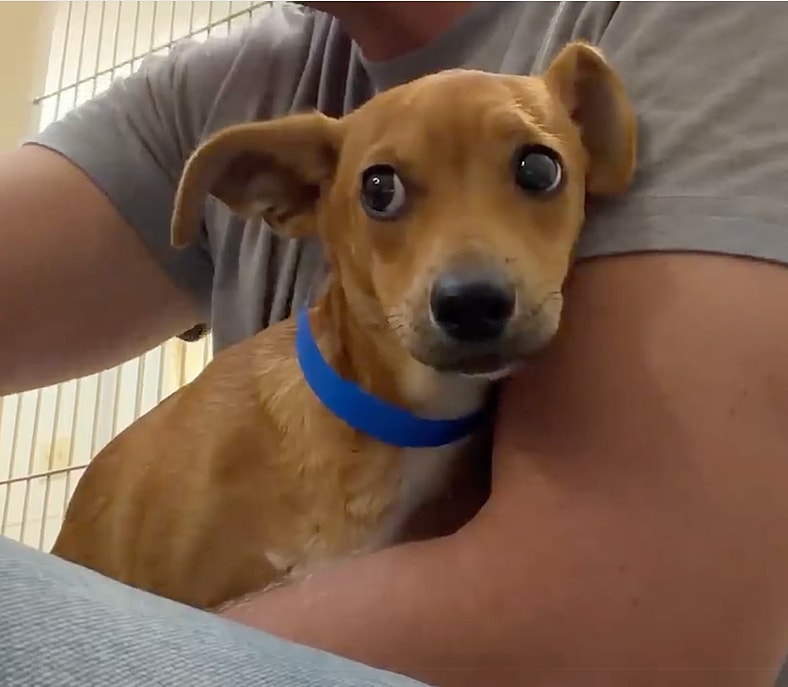 Cocoa arrived without a microchip and appeared extremely fearful. “He’s only been here about 24 hours,” Alexis explained, “and he’s absolutely terrified. He’s just a baby who hasn’t had any exposure to a normal home environment.”