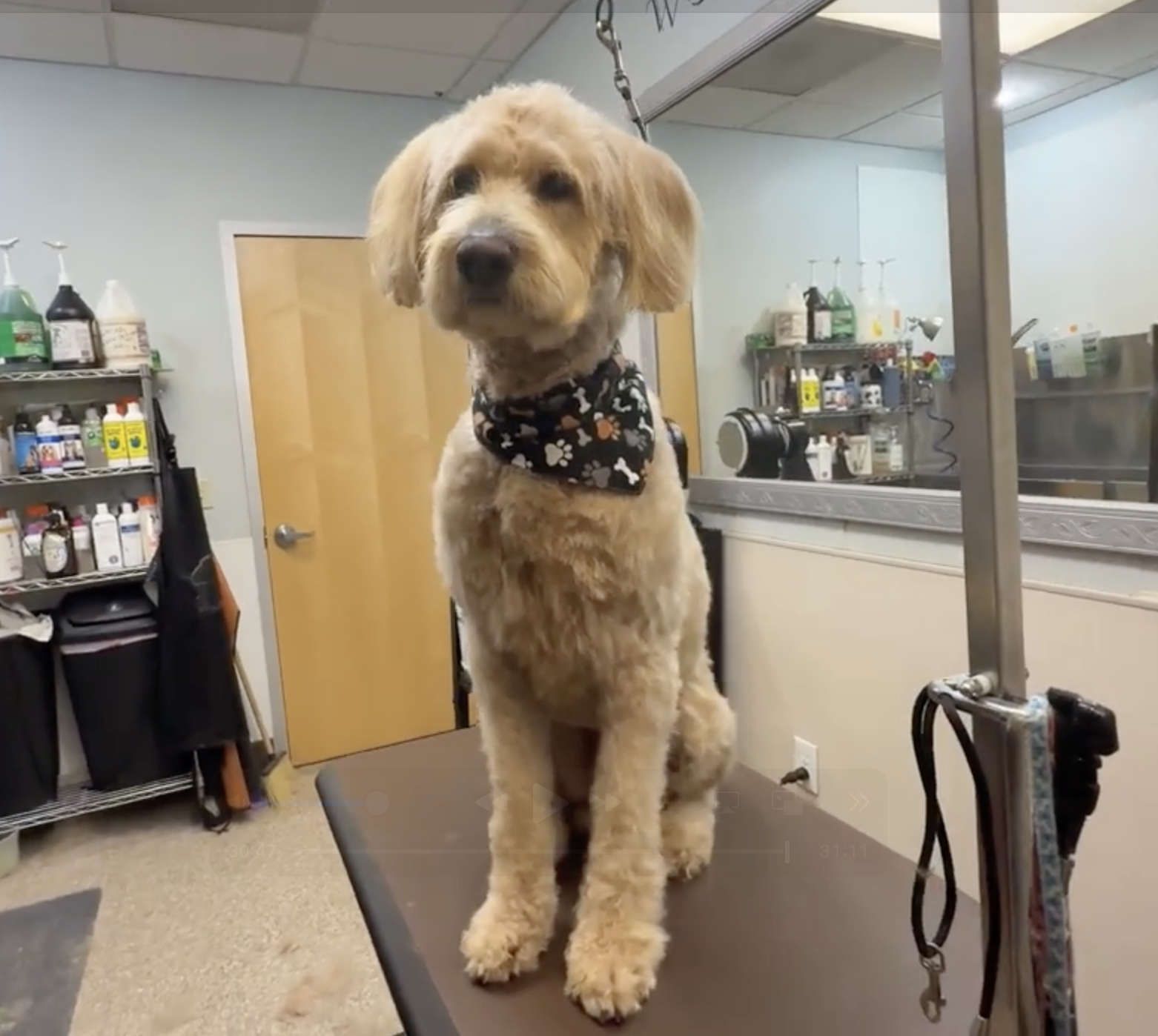 The before: a frozen, matted creature who couldn’t lift his head. The after: a bright-eyed, soft-coated, bandana-wearing doodle who looked ready to take on the world. The floor of the grooming room was covered in what looked like an entirely separate dog’s worth of fur.