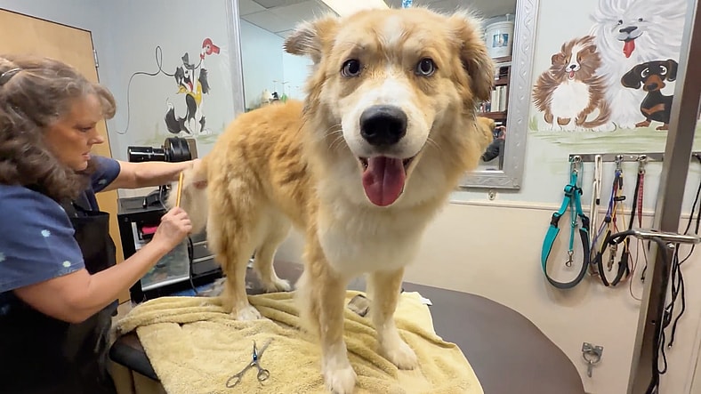 We got her groomed. Cheryl from the shelter coordinated everything. And as they bathed her, as they dried her off, as they removed all those burrs and fox tails from her fur. Something happened.