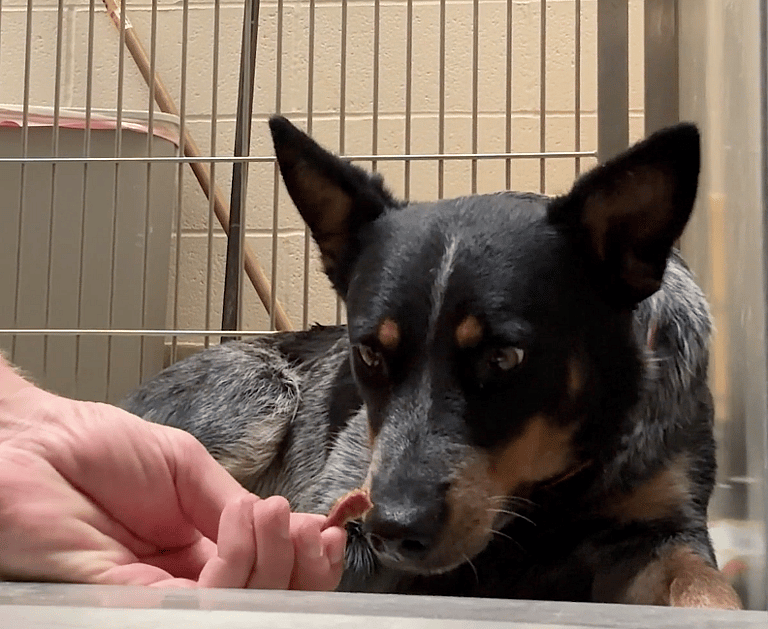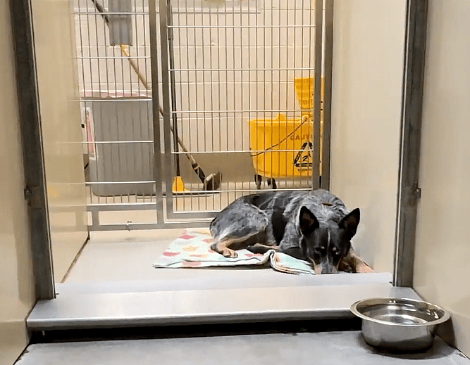 That’s where I first met Cookie, a small Blue Heeler with those characteristic alert ears and wide, worried eyes. She was curled up in the corner of her kennel, visibly anxious, with her rapid, shallow breathing showing just how stressed she was. It was clear she was in flight mode, unsure if she should trust anyone or anything.