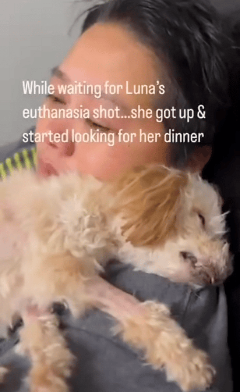 Heartbroken, Taina and her partner, Melo-Jean, reluctantly agreed and even picked out Luna’s urn. But as they sat in the room waiting for the euthanasia shot, something unbelievable happened: the senior dog suddenly stood up and began sniffing around for food. “It was her dinner time,” Taina said, still amazed by her little dog’s determination to live.