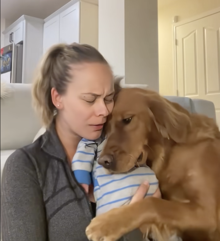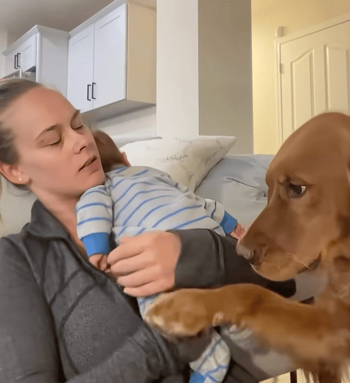 Overwhelmed with emotion, the mother gently pets her loyal pup before kissing her baby. The Golden Retriever then leans back, placing his paw tenderly in her hand as she smiles through tears of love and relief.