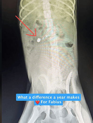 Days later, Fabius returned — but his condition shocked his rescuers. He was dragging his hind legs, and the team initially suspected he had been hit by a car, a common threat for street dogs in the area. However, an X-ray revealed a more horrifying truth: a bullet was lodged in his back.