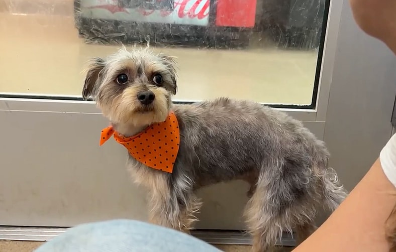 When the amazing shelter groomer Mel, along with Cheryl and the team, gave him a bath and cleaned him up, a new dog emerged. You could finally see his face — those bright eyes, that tiny chin, and a look that said, “I might be ready to try again.”